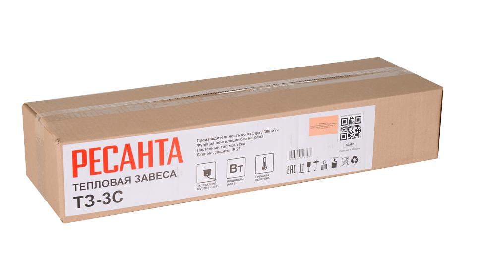 Модель РЕСАНТА ТЗ-3С состоит из стального корпуса с вентиляторами и обогревателями, расположенными внутри. Вентилятор производит всасывание воздуха через перфорацию на передней стенке и создаёт мощный поток, который проходит через нагреватели и в нагретом состоянии выбрасывается в виде узконаправленной струи. Завесу можно применять также и летом для защиты кондиционируемых помещений от тёплого наружного воздуха. В этом случае включается режим «без нагрева», когда электрообогреватели попросту не включаются. Питание прибора осуществляется от бытовой электросети 220 В, 50 Гц.