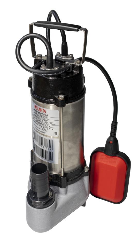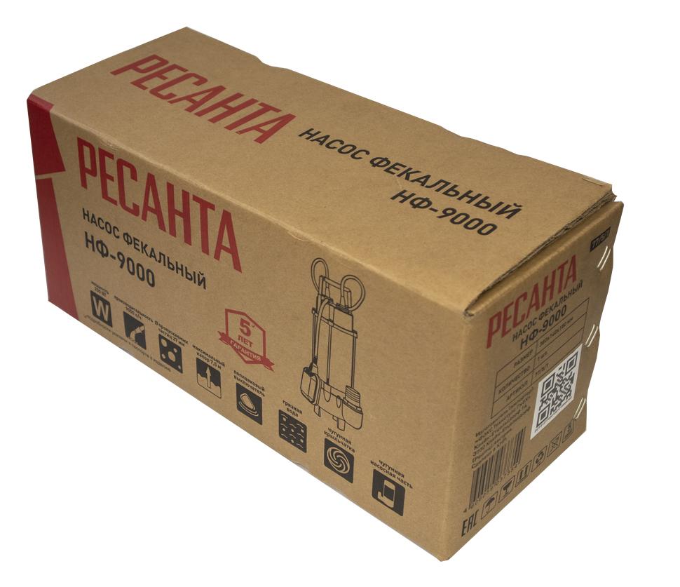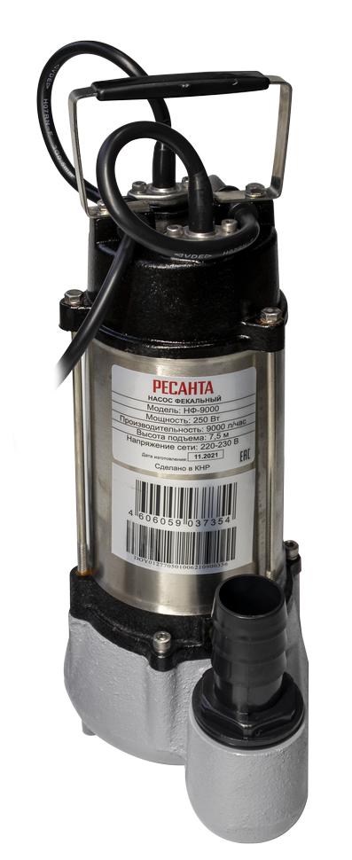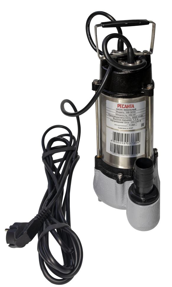 Конструкция полностью герметичная. Степень защиты – IPX8. Мощность этого фекального насоса 250 Вт. Электродвигатель однофазный, асинхронный. Объём перекачиваемой жидкости – 150 л/мин. Высота подъёма – 7.5 м. Количество включений – до 20 в час. Выходное отверстие насоса – 1.25". В модели Ресанта НФ-9000 установлен поплавковый выключатель, отрегулированный на определённый уровень срабатывания, который можно изменять путём регулирования длины кабеля поплавка. Питание агрегата осуществляется от электросети – 220 В, 50 Гц.