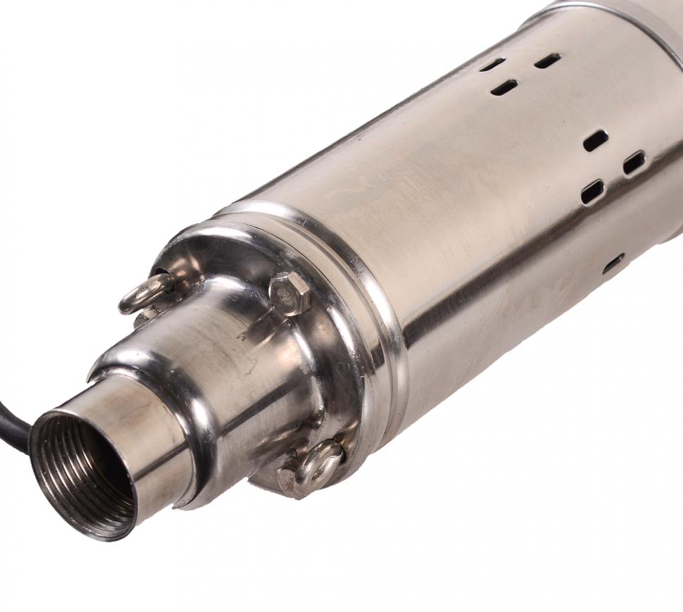 Устройство имеет диаметр 75 мм, может погружаться в воду на глубину до 35 м и работать там длительное время. Электропривод надежно защищен прочным корпусом из нержавейки, насосная часть выполнена из хромированной стали. Длина кабеля составляет 20 м. Винтовая модель с верхним забором воды обеспечивает равномерную подачу жидкости. Мощности двигателя достаточно для обеспечения подъема на высоту до 60 м. Скважинный насос работает с относительно чистыми жидкостями без механических включений, большого количества песка (содержание песка не должно превышать 50 г/м³), температура воды не должна превышать +35 градусов. Устройство оснащено тепловой защитой, которая минимизирует риск поломки из-за перегрузки или отсутствия воды в скважине. В случае срабатывания теплового реле и остановки двигателя сначала следует устранить причину перегрева, дать механизму остыть и после этого включать оборудование снова.