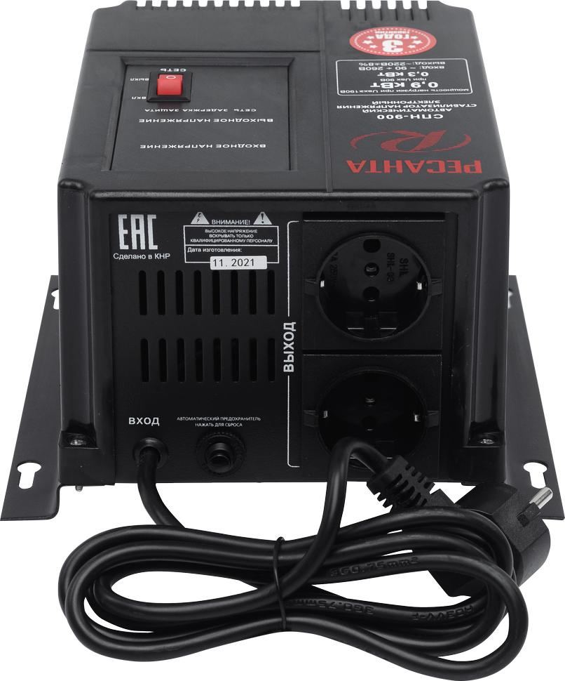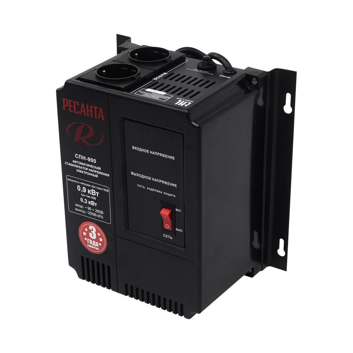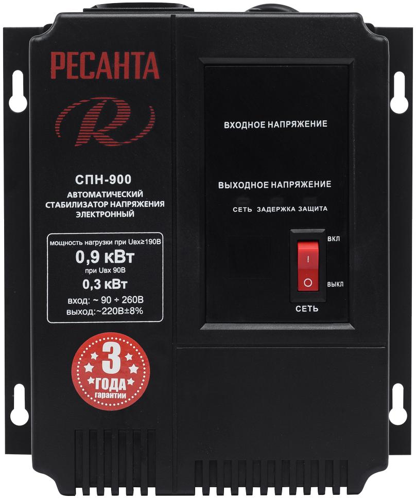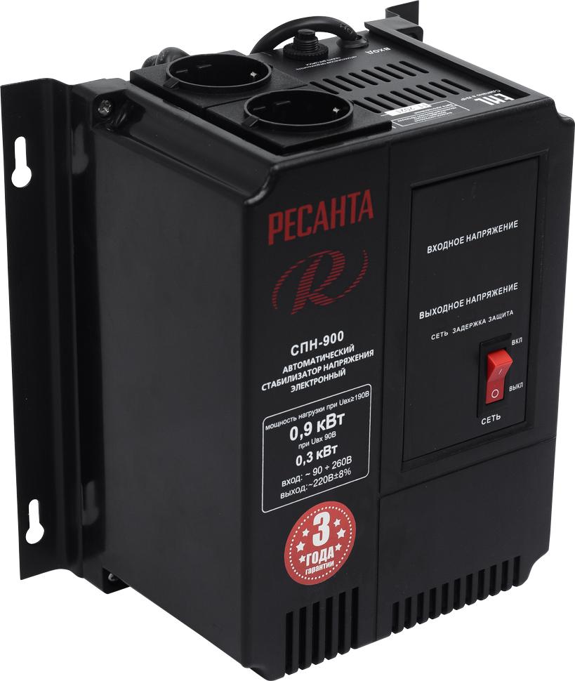 Стабилизатор напряжения релейного типа Ресанта СПН-900 обладает мощностью 900 Вт. Обеспечивает надежную защиту бытовых приборов от высоковольтных импульсов, сетевых помех и перепадов напряжения. Предназначен для однофазной сети. Устройство способно преобразовывать входное напряжение в диапазоне от 90 до 260 В. При этом на выходе бытовые приборы получают допустимые для работы 220. Погрешность не превышает 8%. Естественная вентиляция посредством отверстий на корпусе обеспечивает своевременное охлаждение рабочих элементов. Система защиты от перегрузок автоматически отключает стабилизатор в случае превышения допустимого напряжения. Максимальное время реагирования составляет 15 мс, что защищает бытовую технику от поломок.